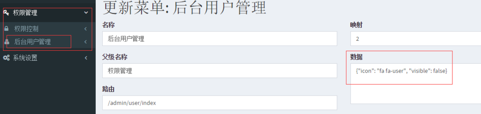 还记得我们一开始创建菜单的时候,唯一没进行填写的选项"数据"吗?为了后续操作方便,我们这里一并把图标和隐藏的选项都填写上。我们以开始截图中的"后台用户管理"这个二级菜单为例进行修改。截图大家先看看我们的菜单目前的状态,