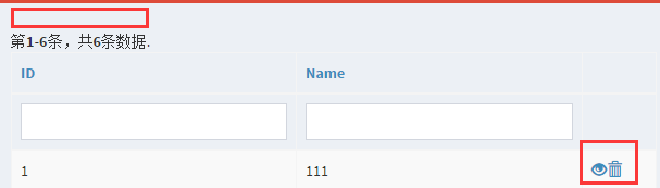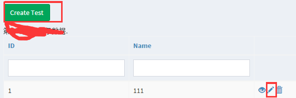 为了方便操作,我们这里增加一个测试表test,我们先用未做修改的gii模版生成一份model+curd。我们先把test/*的所有权限分配给当前登录的用户,并添加一条数据。打开/test我们可以正常看到下面的截图,注意图中的两个标记。