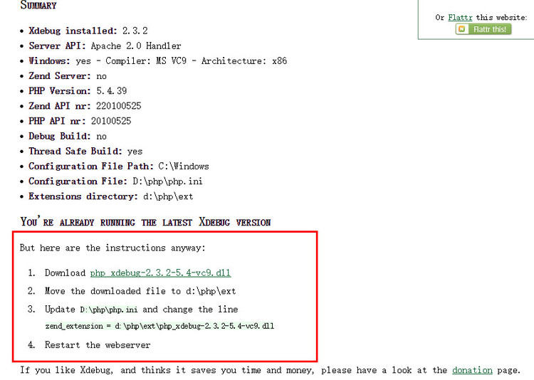 (2)安装XDebug按照上图下载“php_xdebug-2.3.2-5.4-vc9.dll”,将其复制到d:\php\ext\目录。