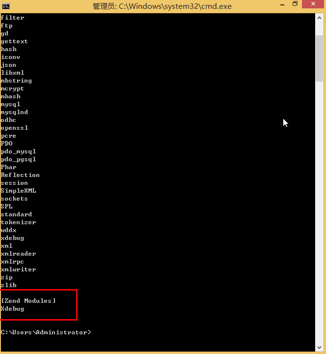 在cmd下输入php -m,能看到XDebug说明配置成功。如下图所示: