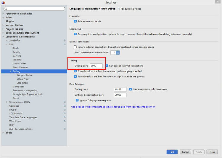 (2)配置PHP Debug找到【Debug】,XDebug中的Debug Port填写9000,其它默认。如下图所示: