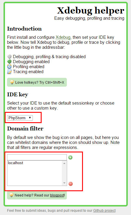 (2)配置XDebug helper插件在上图中,点击【选项】,然后按照如下进行配置:IDE key:PhpStormDomain filter: