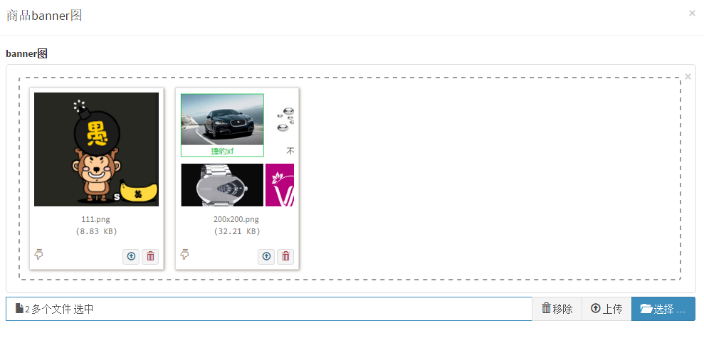 需要提醒的是,每张小图片上的上传是上传对应的小图片,input框(右下角)的上传和移除都是针对所有的图片的操作,一张也是上传,十张也是上传,我们这里只对多图上传的操作做一个必要的说明。