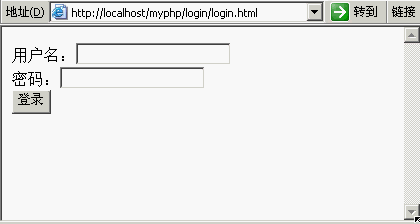 <!DOCTYPE html PUBLIC "-//W3C//DTD XHTML 1.0 Transitional//EN" "http://www.w3.org/TR/xhtml1/DTD/xhtml1-transitional.dtd"> <html xmlns="http://www.w3.org/1999/xhtml"> <head> <meta http-equiv="Content-Type" content="text/html; charset=utf-8" /> <title>登录页面</title> </head> <body> <form action="login.php" method="post"> 用户名:<input type="text" name="username" /><br /> 密码:<input type="password" name="password" /><br /> <input type="submit" value="登录" /> </form> </body> </html>