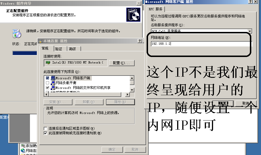 4、安装的过程中,可能会要求你设置IP地址,点击Microsoft网络客户端选择“属性”,随便指定一个IP给Windows2003就可以的,这不是我们最终给用户呈现的IP,没关系的。