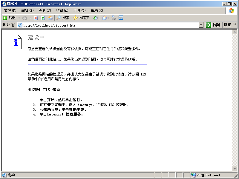 5、等待安装完成,IIS就安装完毕了。完毕之后,你可以打开IE6浏览器,直接输入http://localhost/iisstart.htm,看到一个“建设中”的页面就对了,表明IIS已经成功运行了。