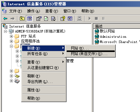 1、通过开始->设置->控制面板->管理工具->Internet 信息服务(IIS)管理器打开IIS,右键网站->新建->网站