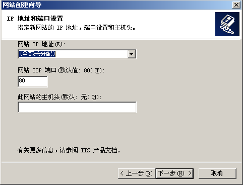 2、网站描述任意,这里以phpSite为例,设定发布网站的IP与端口,这里可以直接使用80端口,因为Windows2003的80端口本身就是给IIS所占据。下面以IP为192.168.80.128这个内网地址为例。