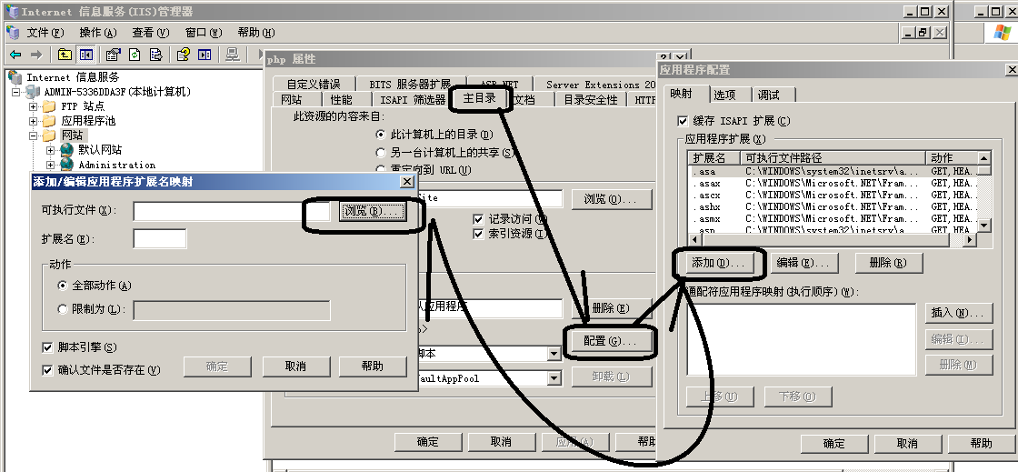 5、翻到“主目录”选择“配置”->"添加"->"浏览",选择C:\WINDOWS\system32\inetsrv\fcgiext.dll,扩展名填写为.php。在动作一栏,为了安全可以限制为:GET,HEAD,POST,DEBUG。如下图: