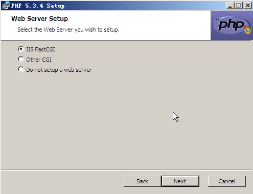 下载好后,打开安装程序,经过引导,配置好路径,来到选择“web server setup”的地方,在这里我们选择“IIS fastcgi”(图9)