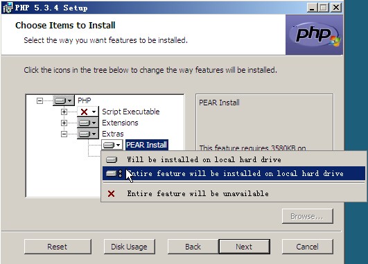 然后点击“next”按钮,到了选择安装选项的步骤,一般安装默认的就可以了,如果要添加的话需要点击一下前面的磁盘小图标,然后选择安装,第一项是只安装选中的项目,第二项是安装所有该项目的子项目。(图10)配置好后进入下一步
