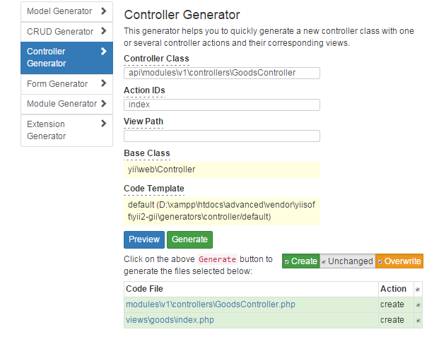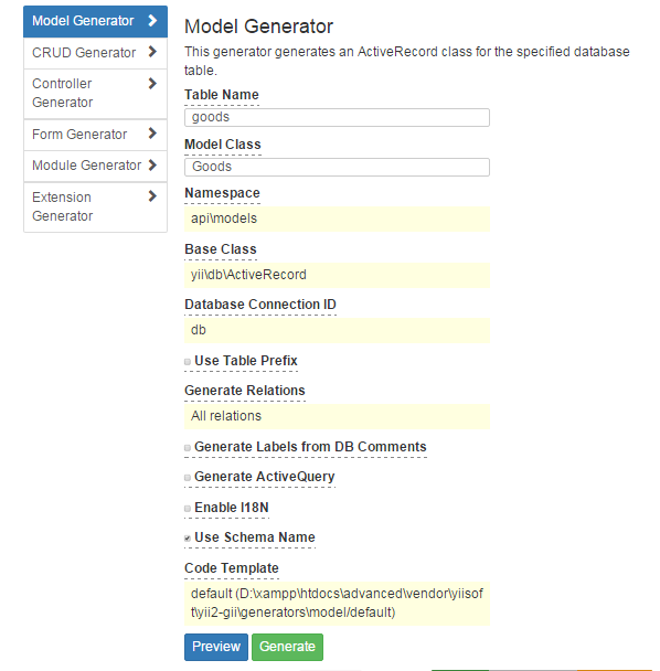 接着我们先利用gii生成modules后,再利用gii模块,按照下图中生成goods信息