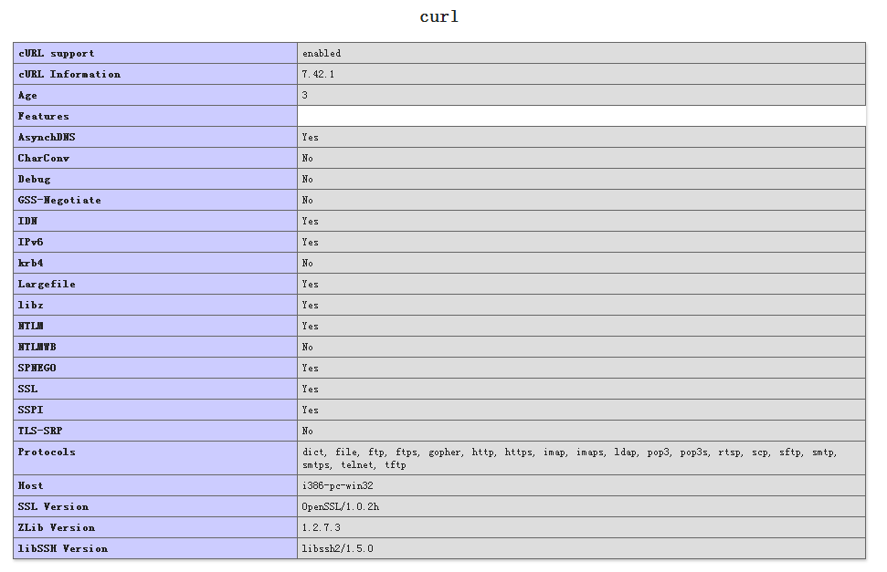 最后试了一下,把当前php根目录下的libssh2.dll 放在apache/bin目录下,重启了一下apache,OK,终于看到了phpinfo里的curl模块的信息了,程序自然也可以运行了