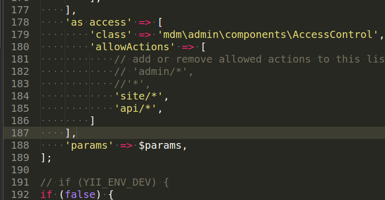 'as access' => [ 'class' => 'mdm\admin\components\AccessControl', 'allowActions' => [ // add or remove allowed actions to this list // 'admin/*', //'*', 'site/*', 'api/*', ] ],