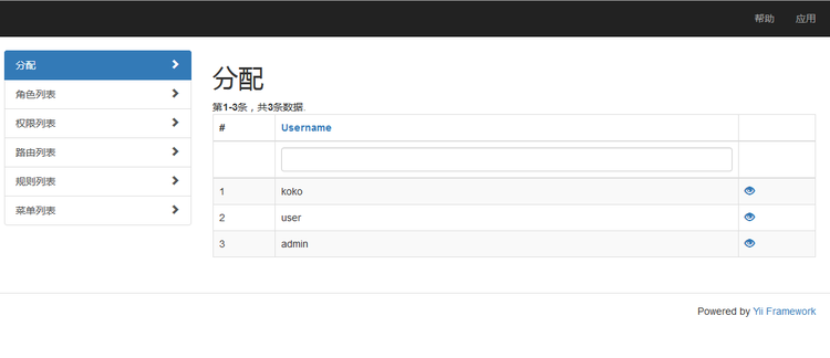 然后我们操作菜单列表。添加菜单项,然后在打开layout文件,其实获取菜单的逻辑已经写好了,在MenuHelper中,添加命名空间mdm\admin\components\MenuHelper; 然后注销原来的导航,添加下面的代码,基本上就可以实现权限-用户-导航的控制了。