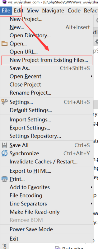 1.左上角菜单栏找到 File ,点击它,之后在出现的下拉菜单选择 Create Project from Exsting files...。