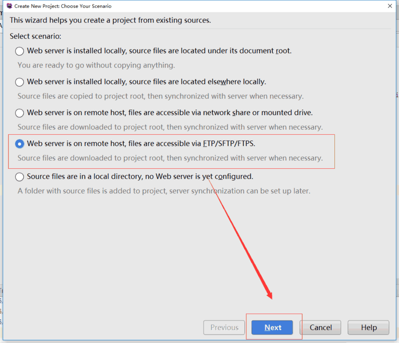 2.会弹出项目选择界面,我们选择 Web server is on remote host, files are accessible via FTP/SFTP/FTPS. , 点击 next 下一步。