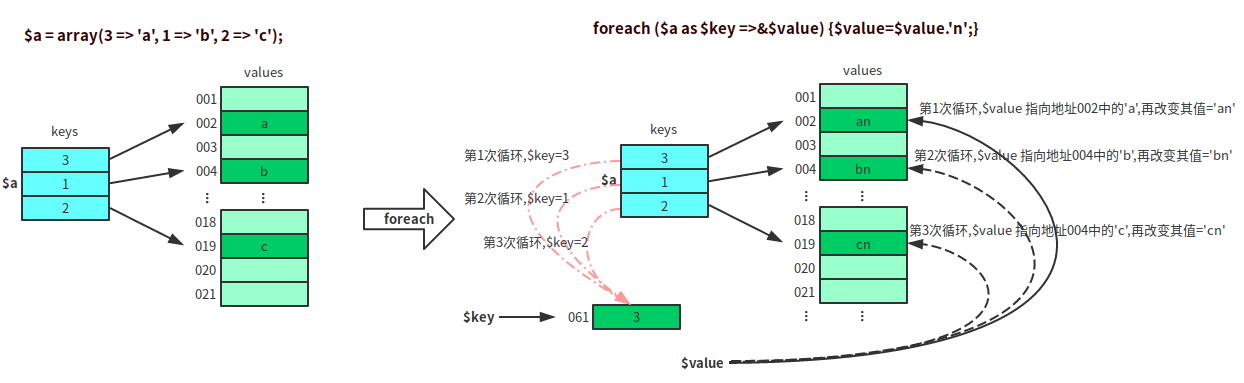 每次循环中, $value 都指向当前数组中单元的值,再执行“ $value.='n'; ”代码 ,如下图描述: