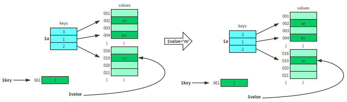 当 修改$x的值='y',也等同于修改$a[1]的值='y'。