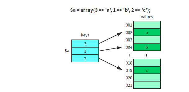 [注]:使用箭头描述数组$a各个单元对应某一内存地址的数据值(实际上,它内部结构采用HashTable结构,可以参考鸟哥写的PHP中的Hash算法)。