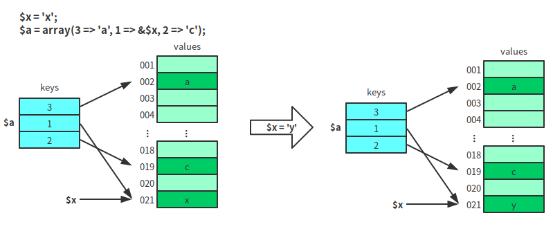 $x = 'x'; $a = array(3 => 'a', 1 => &$x, 2 => 'c'); echo "<hr>"; echo var_dump($a); $x = 'y'; echo var_dump($a);
