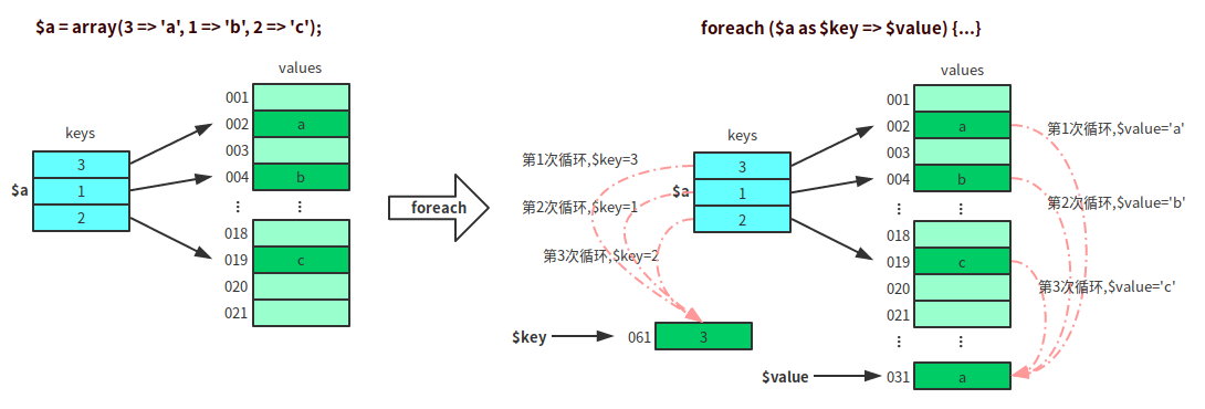 每次循环中,当前数组中单元的值被赋给 $value ,单元的键key被赋给$key。如下图描述: