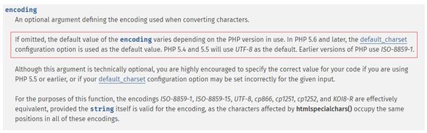 官网描述:5.4版本之前此函数的默认编码为ISO-8859-1,5.4和5.5版本默认编码为UTF-8,5.6之后则使用配置编码作为默认编码。 p>