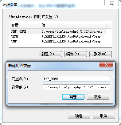 1.添加环境变量,名字为PHP_HOME,值为php文件安装目录下的.exe文件地址,如D:\wamp\bin\php\php5.5.12\php.exe