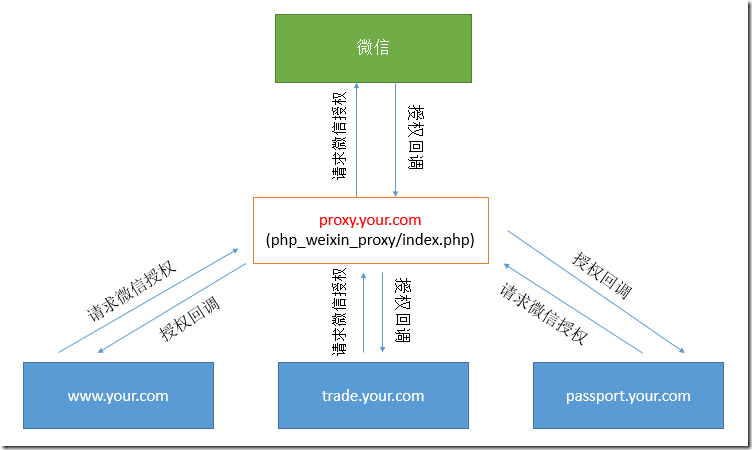 当其它业务需要发起微信授权时,将授权请求先发到proxy.your.com,然后proxy.your.com会把这个请求转发到微信;