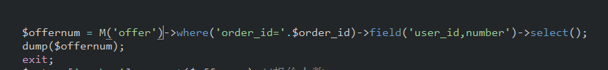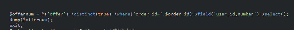 $offernum = M('offer')->distinct(true)->where('order_id='.$order_id)->field('user_id,number')->select();