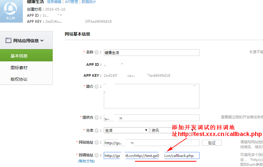 2、在QQ互联的应用信息编辑中将本地添加的测试回调域名加入到回调地址中,用 ; 好分隔,修改的时候要再次点击验证,然后保存即可