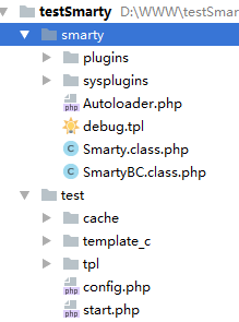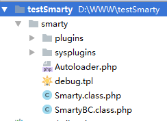 我使用的PHP调试环境的程序集成包是phpstudy,默认在D盘会有一个WWW的文件夹,在WWW文件夹中创建一个testSmarty的文件夹,testSmarty文件夹就是本次练习Smarty的项目根目录。在testSmarty中创建一个smarty的文件夹,并将libs中的文件复制到这个smarty文件夹中。目录结构如下: