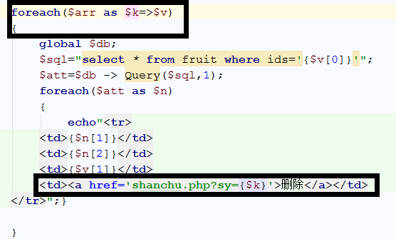 <a href='shanchu.php?sy={$k}'>删除</a></td>