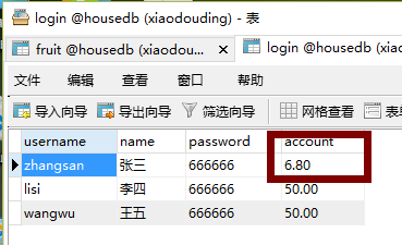 备注:因为之前有过多次测试用的都是zhangsan的账号, 所以login表中的account价格发生了变化,变为33.6元,我们放入购物车的产品价格是16.8元,所以这里是没有问题的。