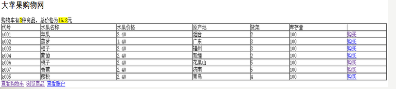 </tr>";} } ?> </table> <div> <a href="gouwuche.php" rel="external nofollow" rel="external nofollow" >查看购物车</a> <a href="main.php" rel="external nofollow" rel="external nofollow" >浏览商品</a> <a href="zhanghu.php" rel="external nofollow" rel="external nofollow" >查看账户</a> </div> 14 15 </body>