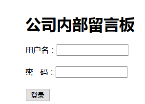 <form action="chuli.php" method="post"> <div style="margin-left: 500px; margin-top: 200px; height: 250px; width: 250px">/*为了把登录表放到页面中间,比较美观*/ <h1>公司内部留言板</h1> <div style="margin-top: 20px">用户名:<input type="text" name="username"/></div><br/> <div>密 码:<input type="password" name="password"/></div><br/> <div><input type="submit" value="登录"/></div> </div> </form>