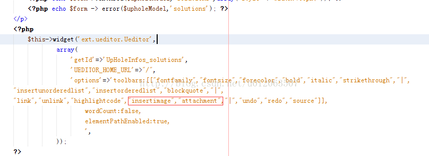 将Ueditor集成到YII框架中后,参照editor_config.js中的toolbars中的内容,更改options中标签可以给编辑器添加想要的功能:
