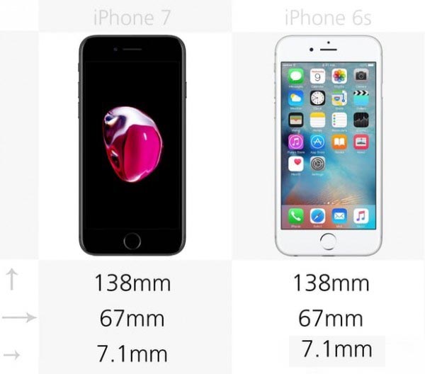 尽管机身尺寸没有差异,但是新款iPhone 7要比去年的iPhone 6s轻了5g,约4%,大约是两枚便士的重量。