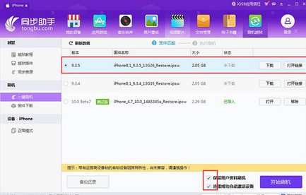 2.同步助手会自动匹配可刷机的固件iOS9.3.5,只需要点击【下载】按钮,等待固件下载完成