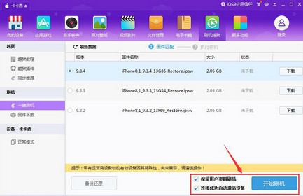 3.固件下载完成后,勾选“保留用户资料刷机”和“连接成功自动激活设备”,点击【开始刷机】