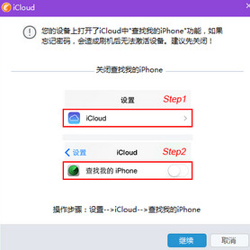 注意:如果你的设备开启了“查找我的iPhone功能”,建议先关闭。因为如果忘记密码会造成刷机后无法激活设备。请前往“设置>>iCloud>>查找我的iPhone”关闭开关。