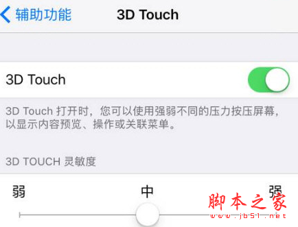 1、打开【设置】-【通用】-【辅助功能】-【3D Touch】,打开3D Touch功能,还可以调节灵敏度,如下图所示: