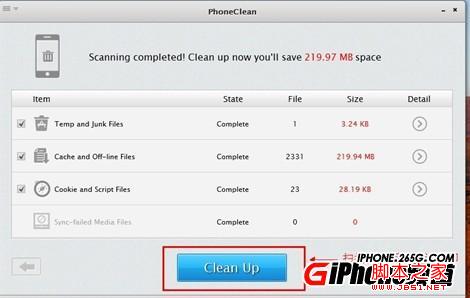 扫描完成后,点击界面的"Clean Up"选项,清理手机内的垃圾文件。