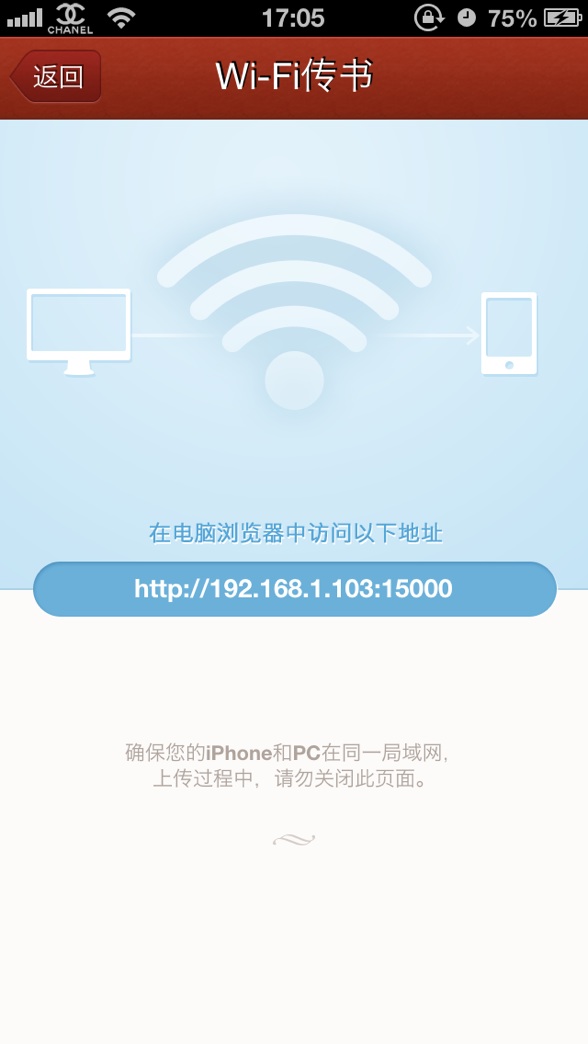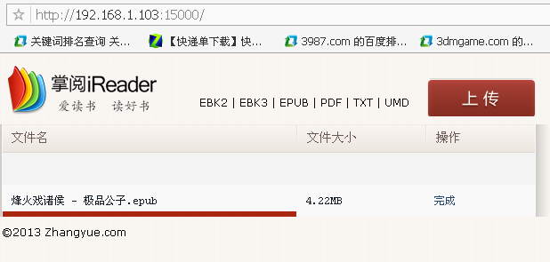 步骤三、在电脑浏览器输入掌阅iReader给出的传书地址。小编这里是:http://192.168.1.103:15000