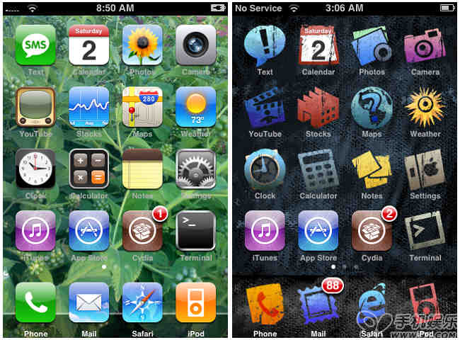 安装 WinterBoard 后,将会在文件系统//Library下生成 Theme 文件夹,里面已经自带了一些主题文件,你也可以下载自制主题包放入相应的文件夹中,然后在 Winterboard 设置里选用。