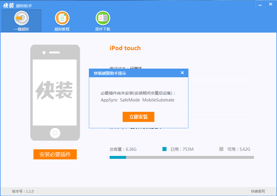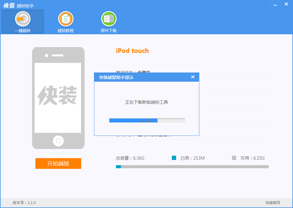 快装越狱助手并没有把所有的越狱工具集成在软件里,而是选择智能匹配的方式来达到越狱的最佳选择,连接设备后,快装越狱助手将自动检测设备的系统和型号,匹配与之对应的越狱工具并安装,iOS7用户将安装evasi0n7,6.1.345用户将安装p0sixpswn最新的越狱工具,下载安装完毕后就可以开始越狱了。