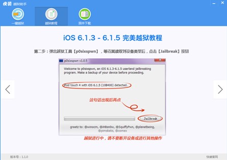 虽说是一键越狱,但是在越狱过程中还是有很多的注意事项,快装越狱助手内部自带详细越狱教程,无论是6.1.x用户还是iOS7.0.x用户,只要连接设备就将匹配与之对应的教程,里边记录了越狱过程中的一点一滴,手把手教你如何进行操作,标明了越狱期间需要注意的问题,还将推荐你在越狱后下载哪些重要的插件。