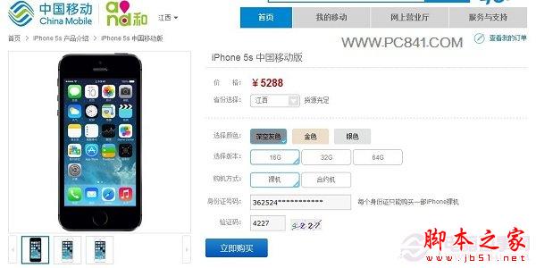 图为移动版iPhone5s移动商城购买界面