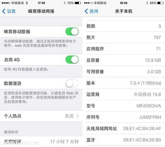 港版A1530更新15.7之后依旧可以直接使用移动4G卡