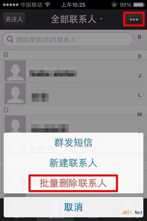 3、点击右上角的【…】选项框,在弹出的列表中选择“批量删除联系人”;